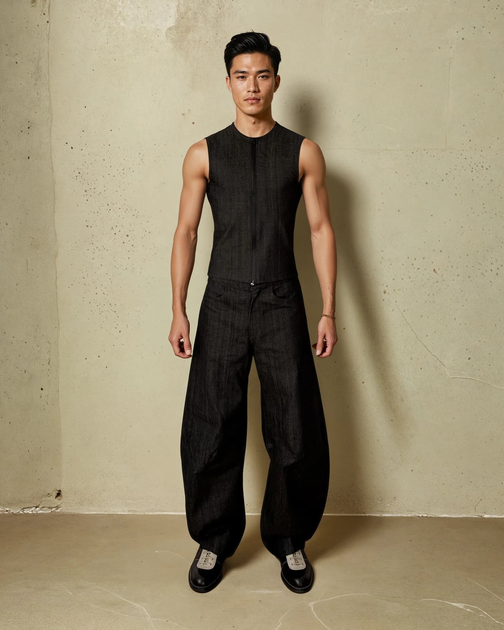 Une silhouette audacieuse rencontre le confort décontracté du denim.