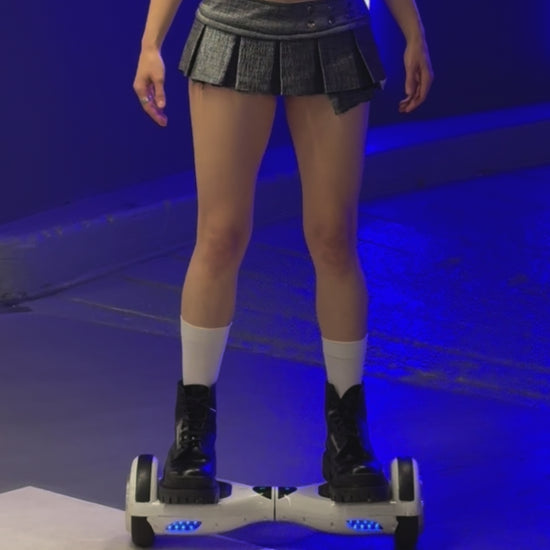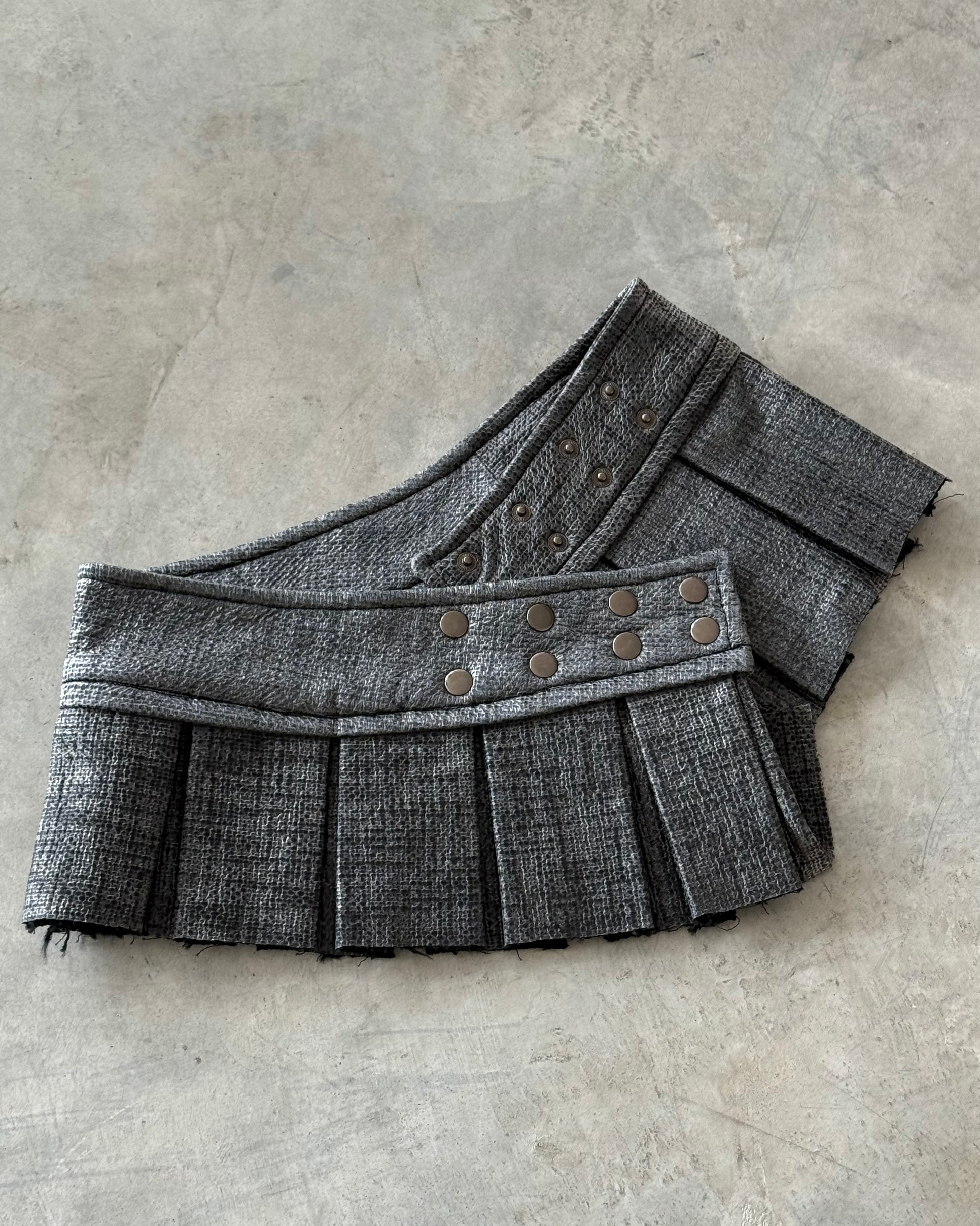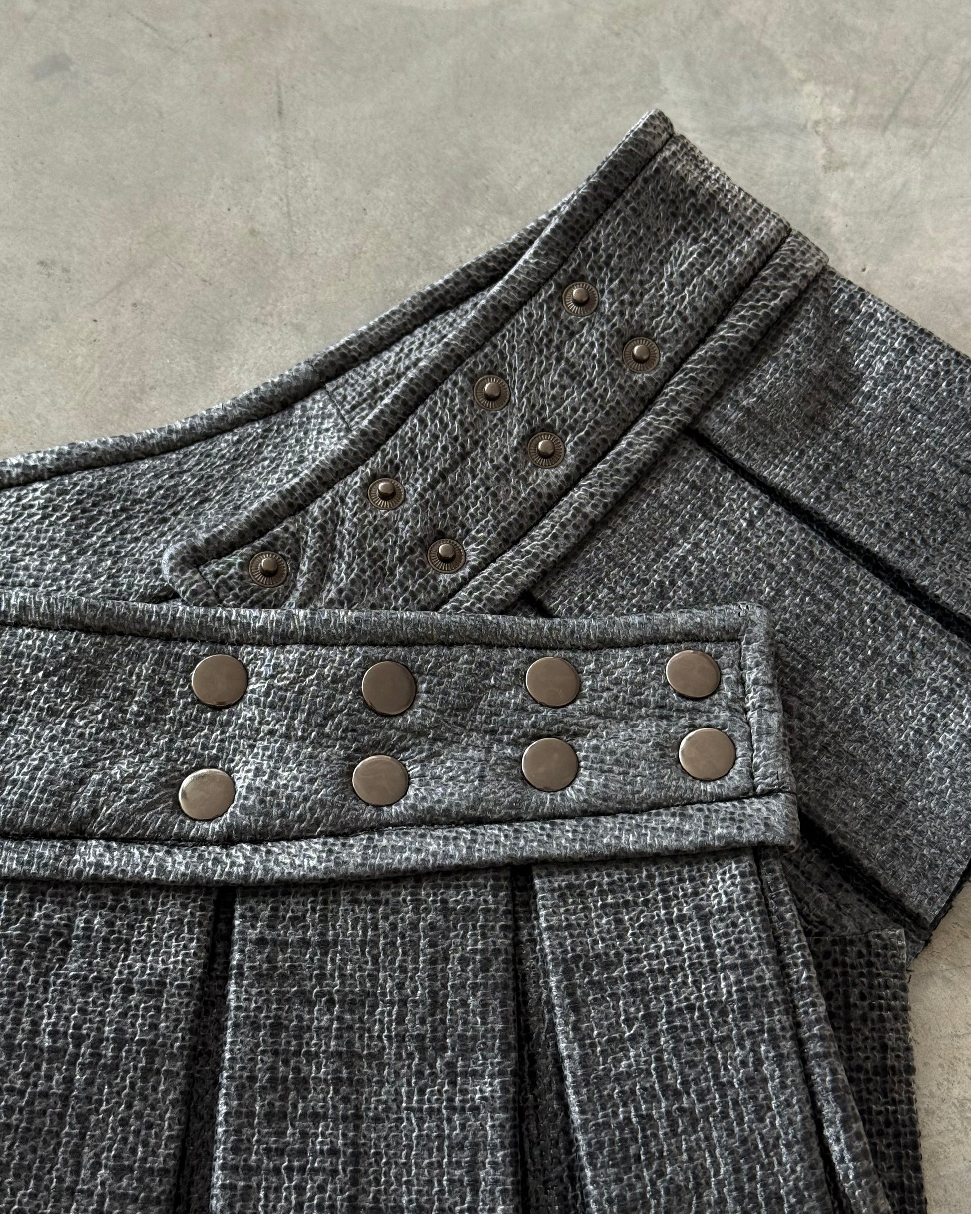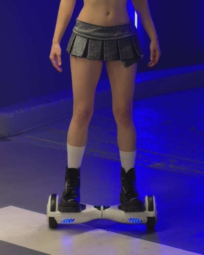 Gleam like smoke, move like steel. The Fogmetal Pleat Skirt is a structured micro-mini crafted from a smooth, futuristic-feel polyester fabric with a misty, metallic texture. The sheen shifts between silver and matte grey, catching light like metal in motion. Soft to the touch but crisp in form, it blends sculpture and wearability.