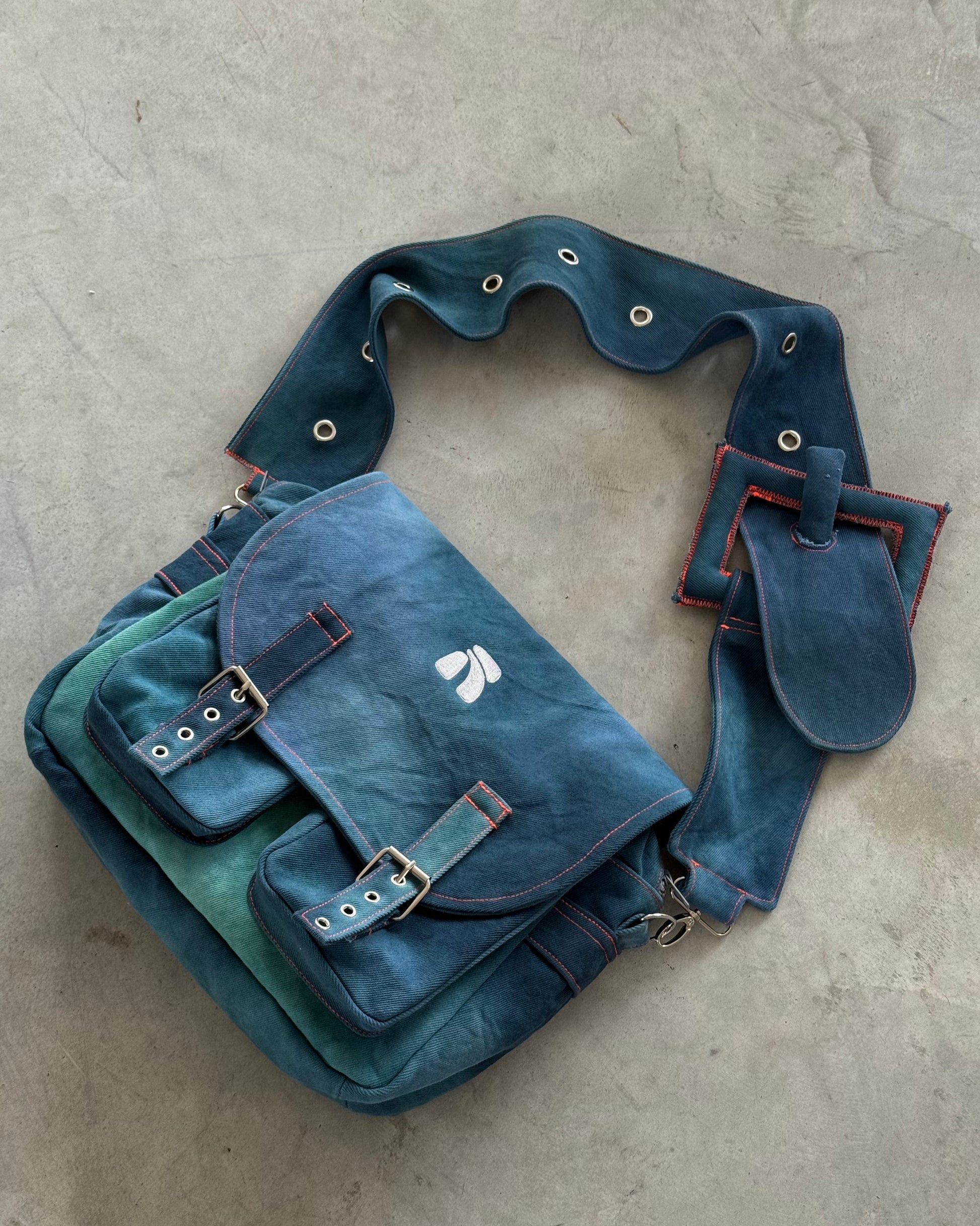 A bag with presence. The Lagoon Belt Messenger is a hand-crafted, large-format shoulder bag made from the same signature cotton tie-dye material as the Lagoon Shorts. Sized for daily essentials and beyond (33cm x 27cm x 14cm), it features a bold flap with embroidered logo, two functional front pockets, and neon orange contrast stitching for a cyber-organic twist.