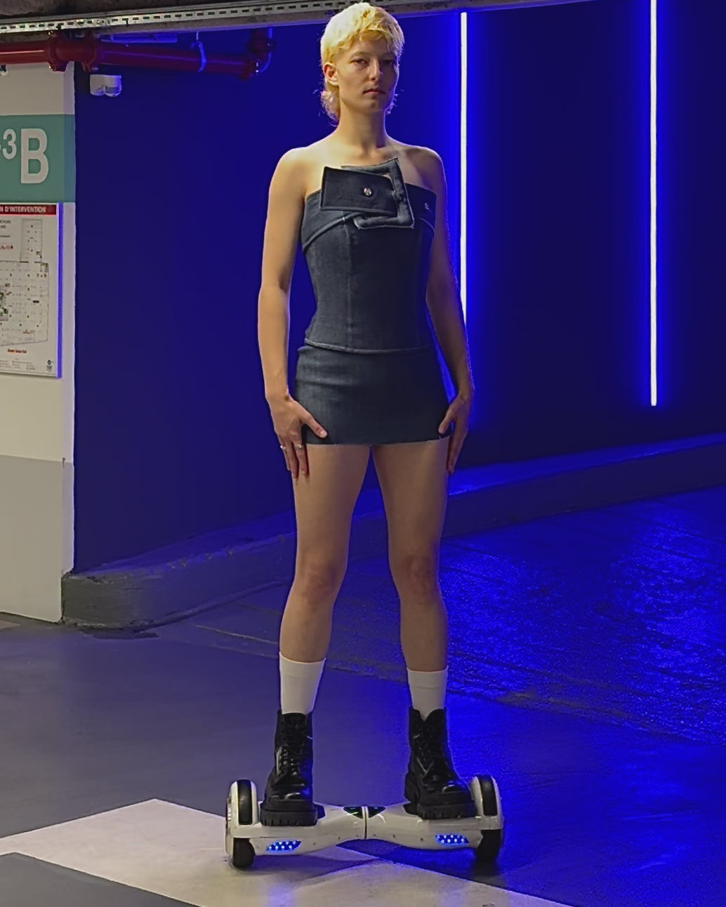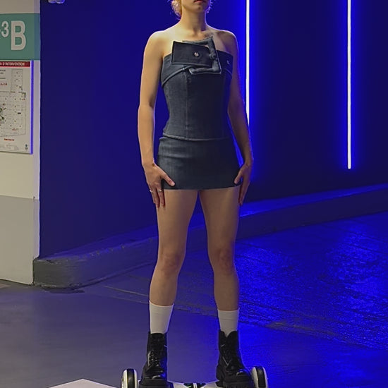 Cinch, strap, sculpt. The Straplock Corset Top is a structured yet flexible piece crafted from stretch black denim (70% cotton / 30% elastane) with a smooth polyester lining. Its centerpiece: a bold oversized belt detail that cuts across the chest like a sculptural strap, merging armor and elegance.