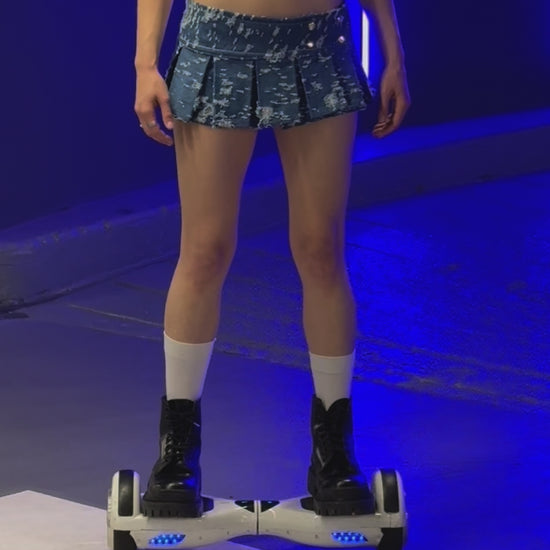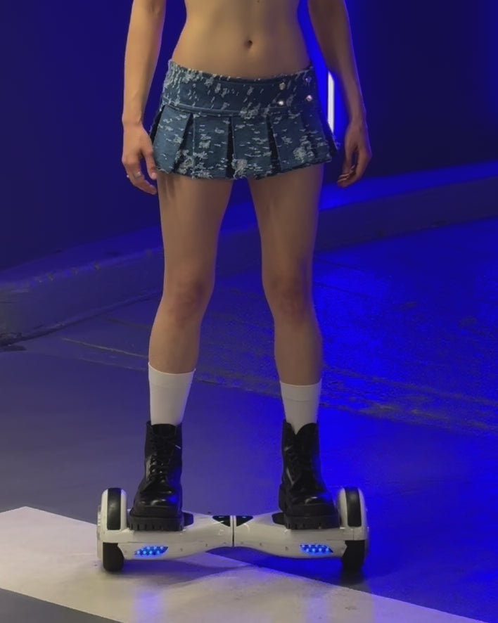 Schoolgirl silhouette meets skatepark destruction. The Distressed Denim Pleat Skirt is handmade from 100% cotton light blue denim, bleached and ripped by hand to create a worn-in, one-of-a-kind look. Sharp micro pleats give it volume and edge, while the adjustable waistband with press buttons ensures a flexible one-size fit.