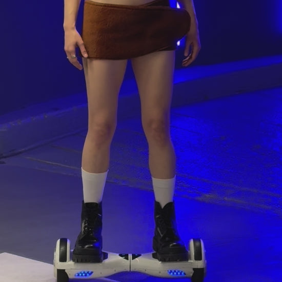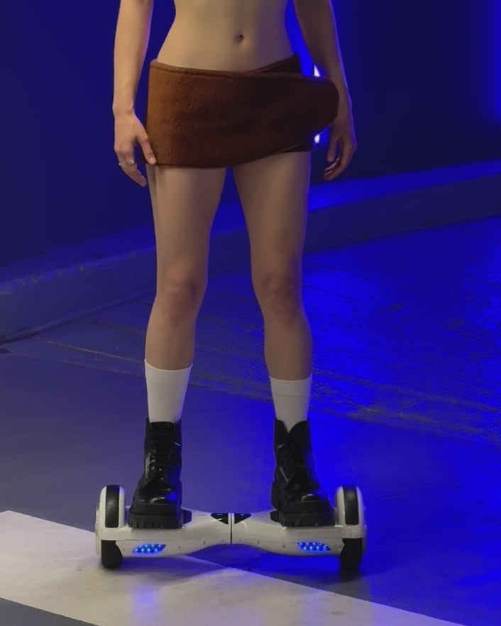 The look is tactile and unexpected—somewhere between cyber rave, sculpture, and caveman cosplay. Wear it solo, over pants, or paired with the matching top for full plush armor energy. Each piece is handmade and unique.